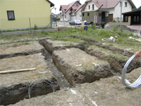 Přípojky a hlavní trasy kanaliazace, vodovodu, elektřiny a plynu.